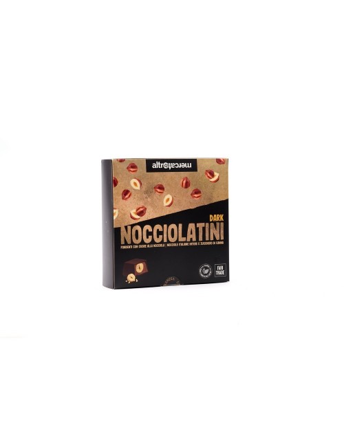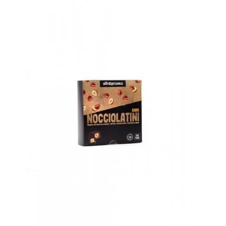 BOMBONES DE CHOCOLATE NEGRO RELLENOS DE CHOCOLATE CON LECHE, PASTA DE AVELLANAS Y AVELLANA ENTERA TOSTADA.