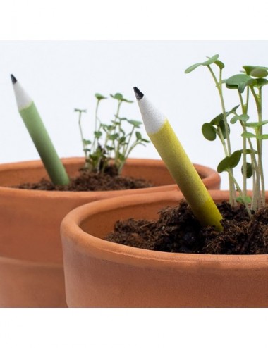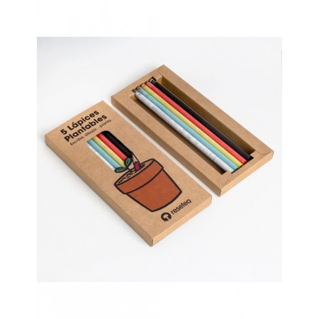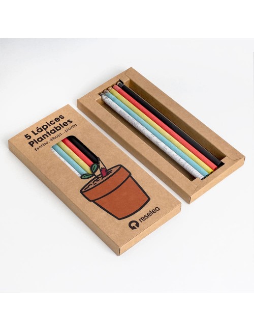 Set de 5 lápices plantables hechos con papel reciclado, ideales para regalar y reutilizar.