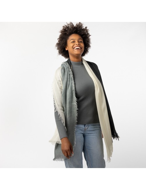 Bufanda hecha a mano modelo NEW SOFT color caqui y negro de algodón orgánico y tintes naturales. Un accesorio de moda sostenible con un diseño actual.