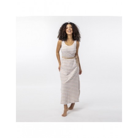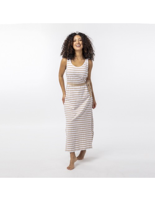 Vestido de algodón ecológico con rayas en color arena, cómodo y natural para mujer.