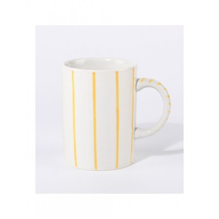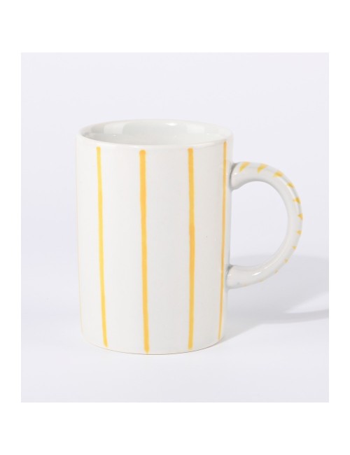 Taza de cerámica con rayas amarillas y diseño moderno, ideal para disfrutar de tu café o té diario con estilo y comodidad.
